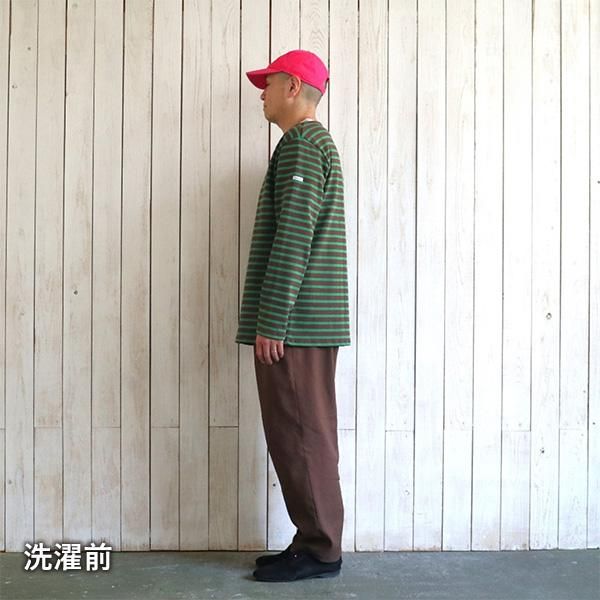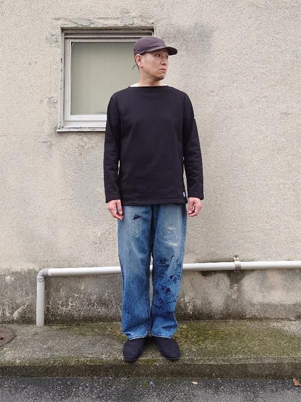 最初は少し硬く、ゴワッとしっかりとした生地感ですが、着るほどに生地がほぐれ、クタッと身体に馴染むやわらかさへと変わっていく。