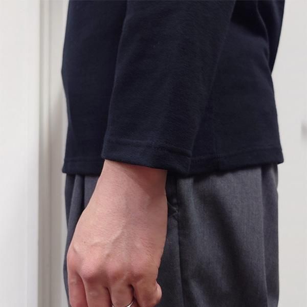 一般的な長袖よりも少し短い袖丈は、個人差ありますが、おおよそ手首がでるぐらいの9分袖。