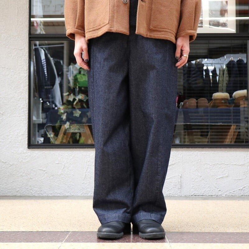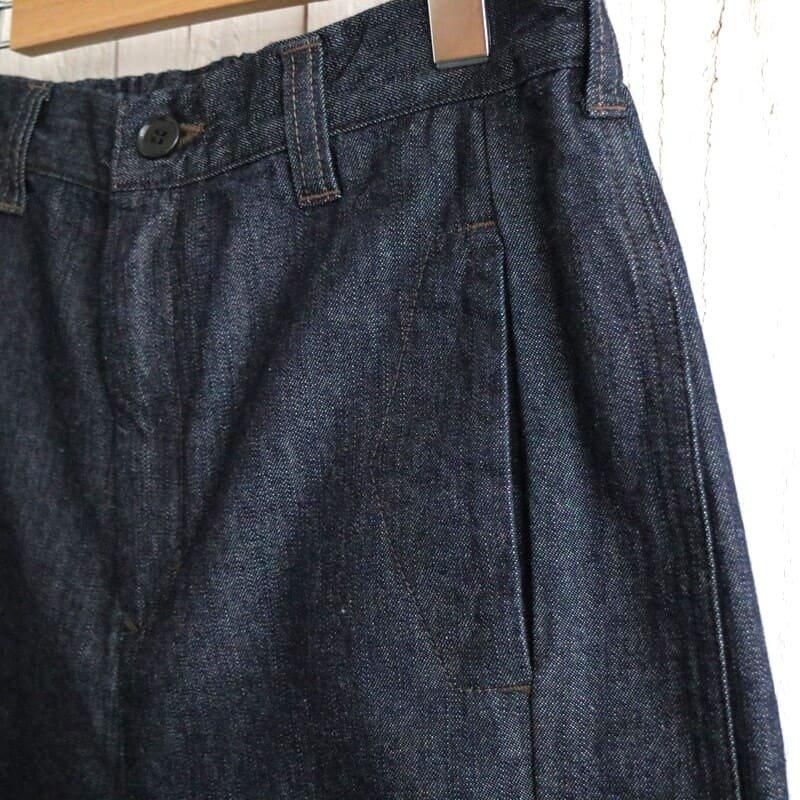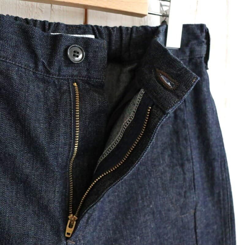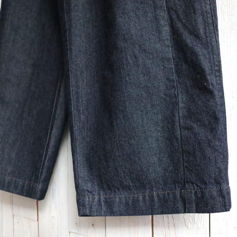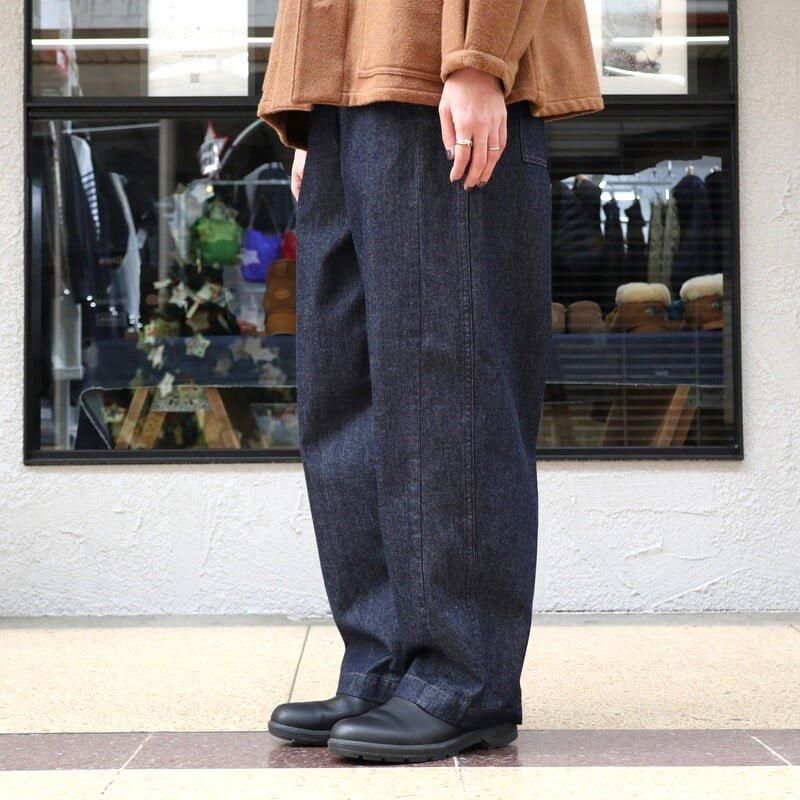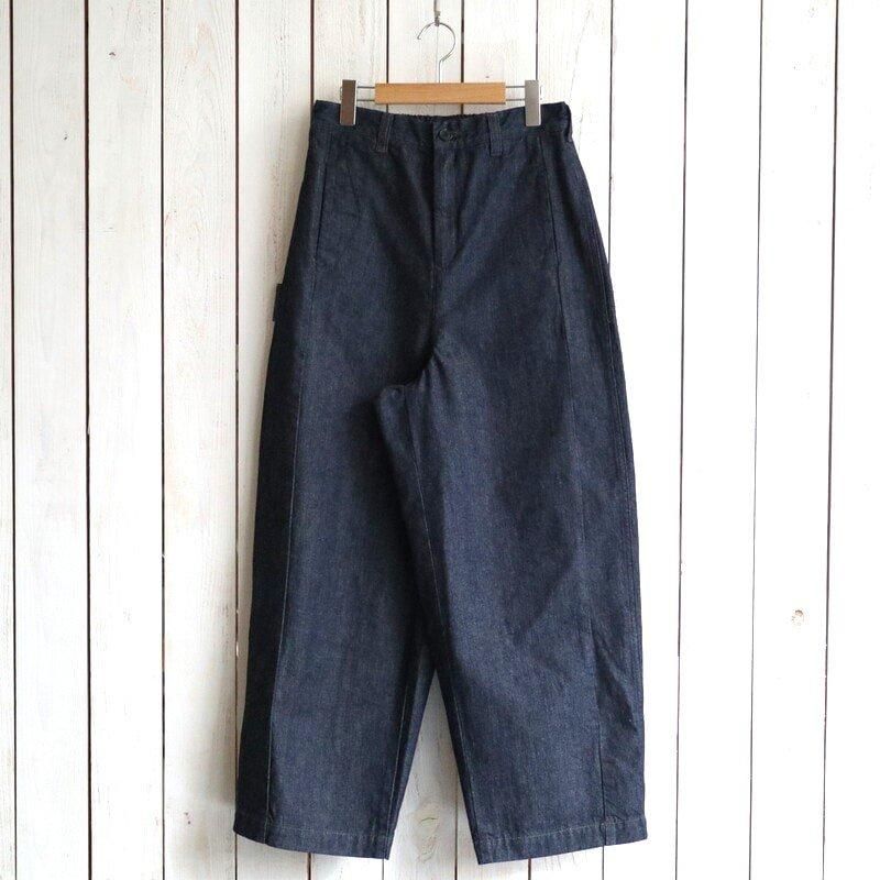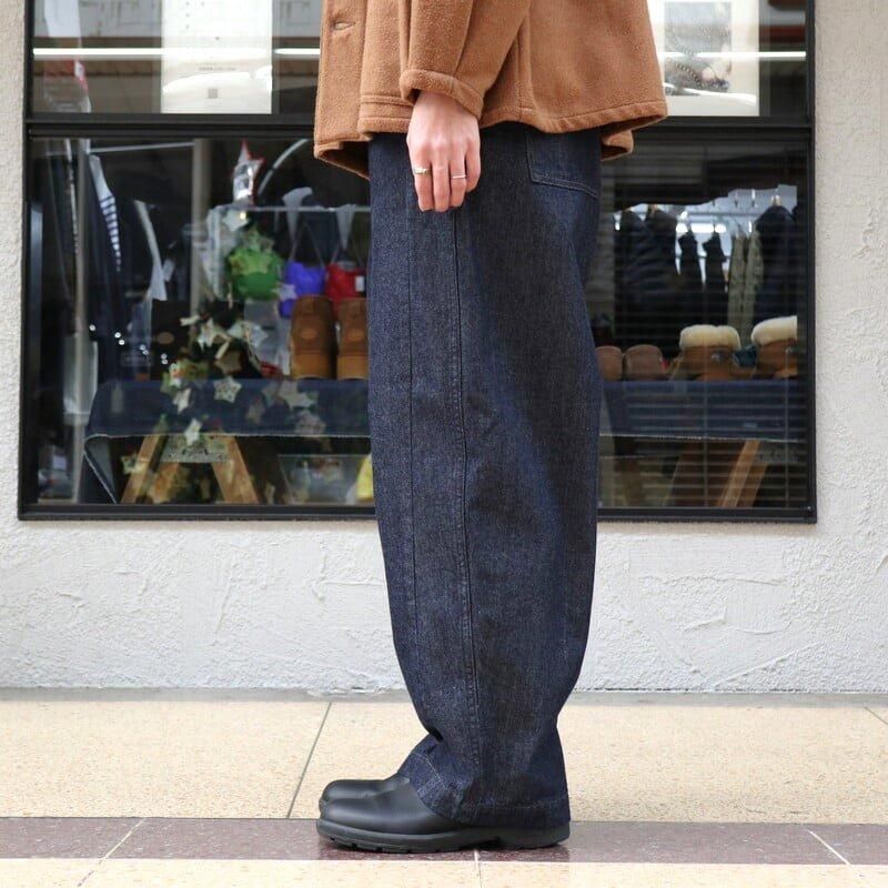 ペインターパンツならではのボリュームのあるシルエット。 カジュアルでもきれいめスタイルでも、しっくりくる艶のある濃いめのワンウォッシュデニムを使用し、ハンマーループはコンパクトに、ツールポケットは無くし、野暮ったくならないようなデザインにアップデート。 デニムらしいハリ感はあるものの適度な柔らかさで、快適な履き心地。 もちろんデニムなので通年履いていただけます。 サイドシームより前側に施された腰から裾への切り替えにより、足回りがスッキリ見える視覚効果も◎ ウエスト後ろはゴムが入りイージーな履き心地です。