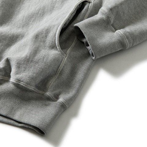 厚手で重量のある生地をストレス無く着用できるように考慮し、肩を包み込むように後ろ身頃の生地を大きく取り、前身頃(肩の前方)で切り替えて縫製。さらに、脇の下から裾にかけてリブ編みのサイドガセットを付けて立体的なパターンに仕上げ、着心地の良さとゆとりあるシルエットを実現しています。身頃は縦織りの生地を横使いすることで、縦方向への伸び縮みを解消させています。腰上のサイドポケットは着心地を損ねないよう袋布にTシャツ生地(5.5オンスジャージ)を使用しゴワつきを軽減させており、ハンドウォーマーとしても快適に使用できます。