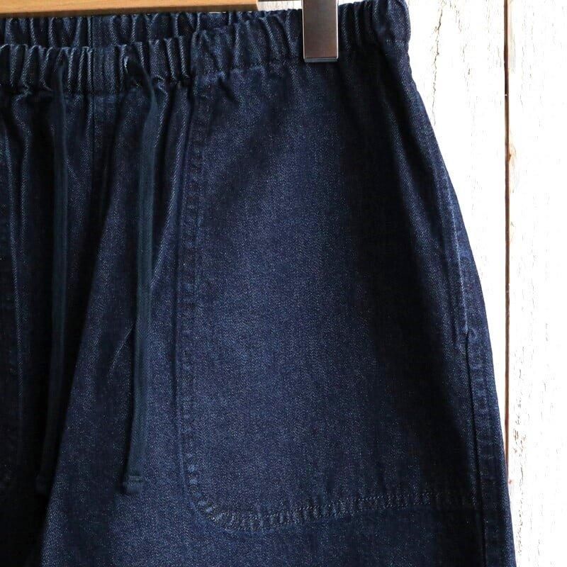 軽く薄手でありながら高密度でしっかりした生地を使用し、フェード感を楽しめる素材。柔らかな質感で軽い穿き心地。フロントは丸みのあるポケット。バックはワークテイストたっぷりの大きい貼り付けポケットがアクセントに。ウエストはゴムと紐仕様で調節可能。
