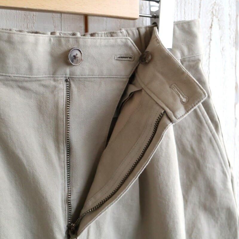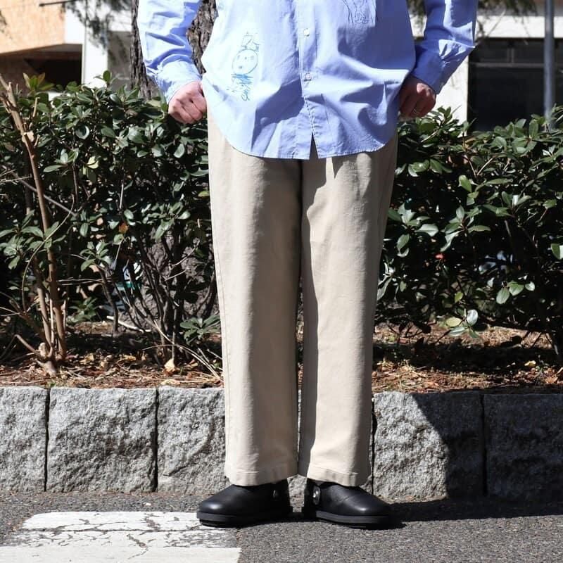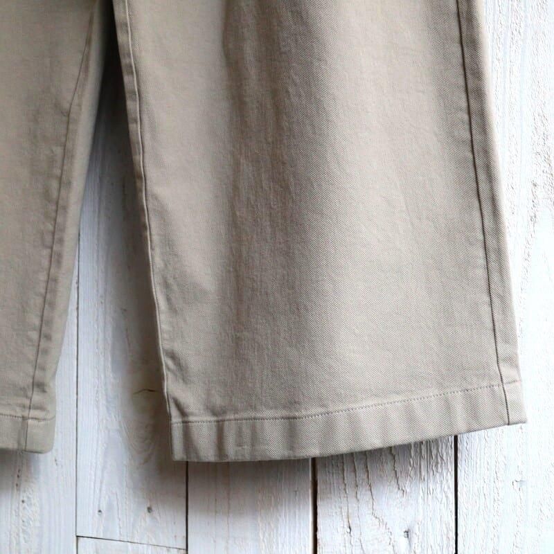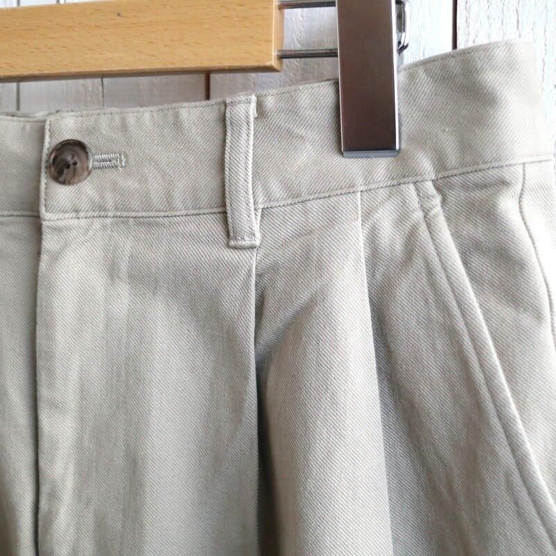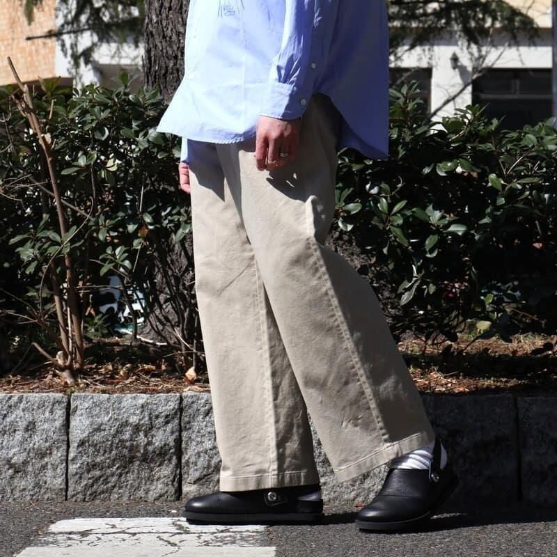 フロントにタックが施されたボリューム感のあるワイドパンツ。 高密度に織られたツイル素材を使用し、 バイオ加工をかけたクタッとさせた表情のある生地感が特長。キレイめになりすぎずカジュアル使いも可能です。ポリウレタンが入っている為ストレッチ性に優れ、快適な穿き心地。
