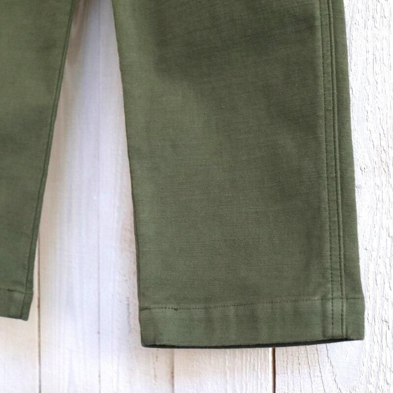 カジュアルな表情が魅力のバックサテン生地は凹凸感とムラ感が特徴。一見ストレッチが効かなさそうにも見えますが、あらゆる動作の自由度を高めた生地感も特徴で、しっかりとストレッチが効いた穿き心地は一度着用すると病みつきになりそうです。