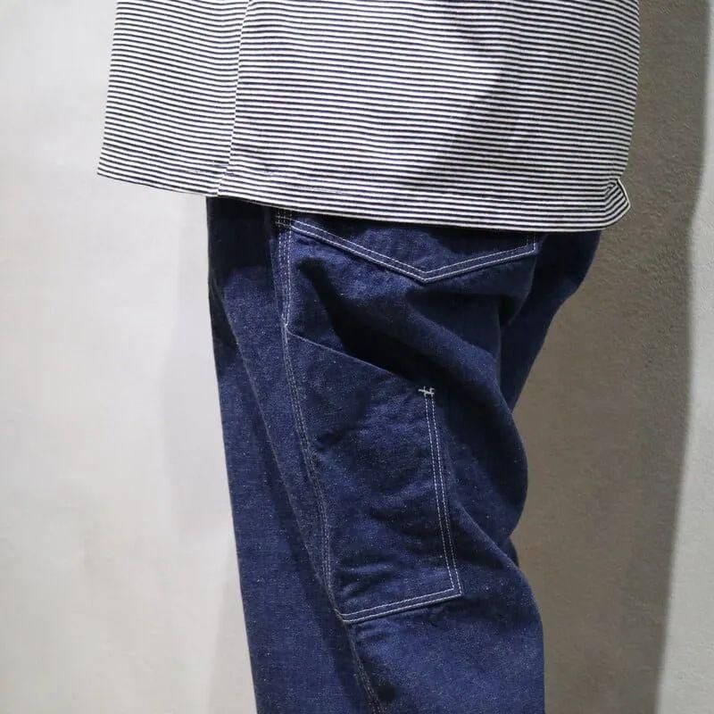 味わい深い経年変化が楽しめるライトオンスのデニム素材を使用。ペインターパンツの特徴でもあるツールポケットやトリプルステッチなど本格的な作りですが、ハンマーループは無く、N.O.UN独自の穿くとややすっきりなシルエットでカジュアルだけに収まらない幅の広いコーディネートを楽しんでいただけます。バックポケットのオレンジタブも良いアクセント。