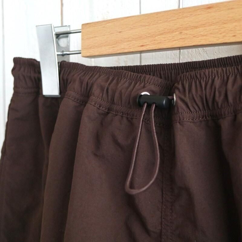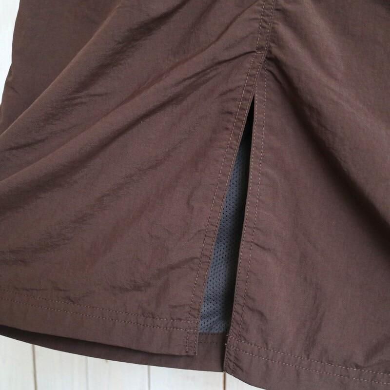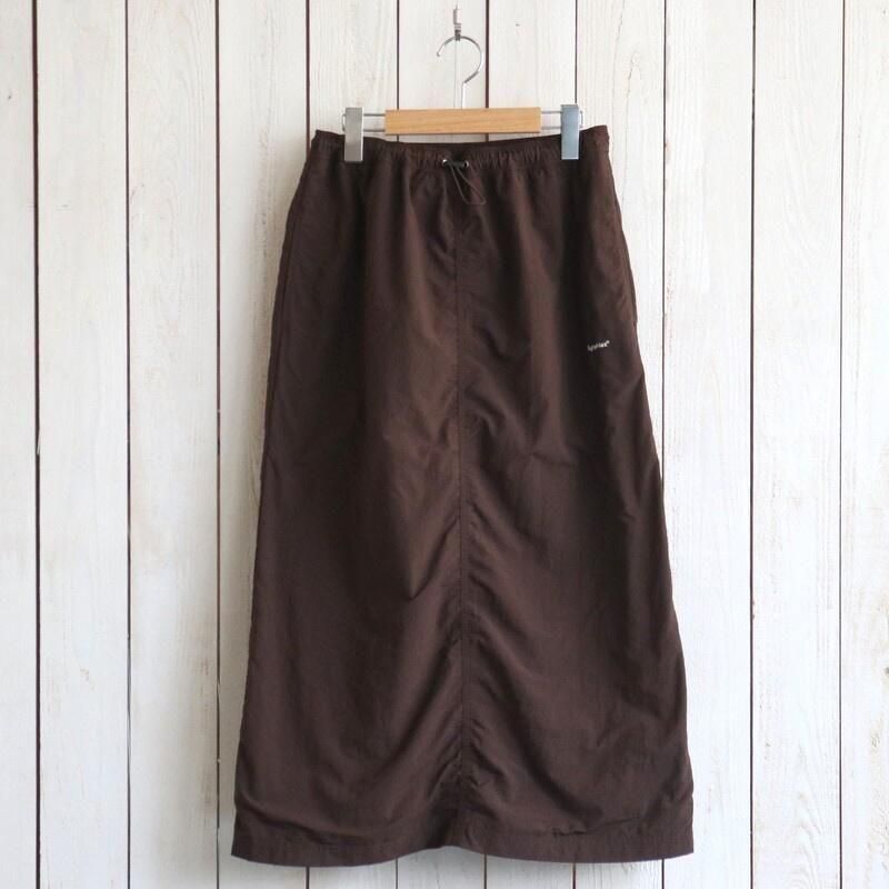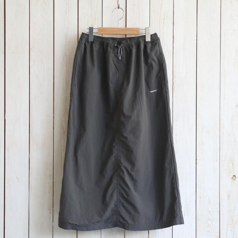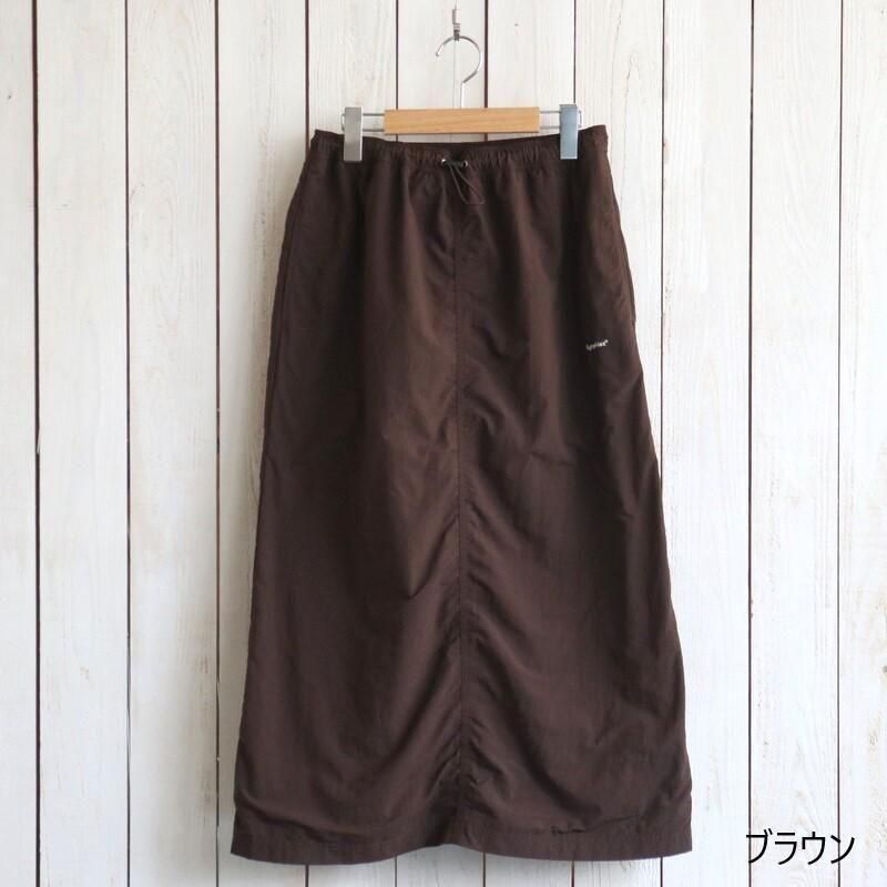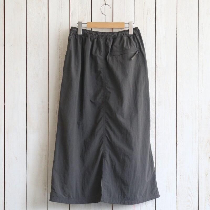 シボ感のあるナチュラルな風合いのナイロンタッサーを使用したロングスカート。 ゴムウエストに伸縮性のあるドローコードを通したイージー仕様。 裏地にはメッシュ素材を使用しているので、透けずに優しい肌あたりです。 ヒップにジップポケット、サイドにシームポケットが付いており機能性も兼備。 後ろ側にはスリットが入り、足さばきもラクな仕様に。 フロントに配色のロゴ刺繍がさりげないアクセント。
