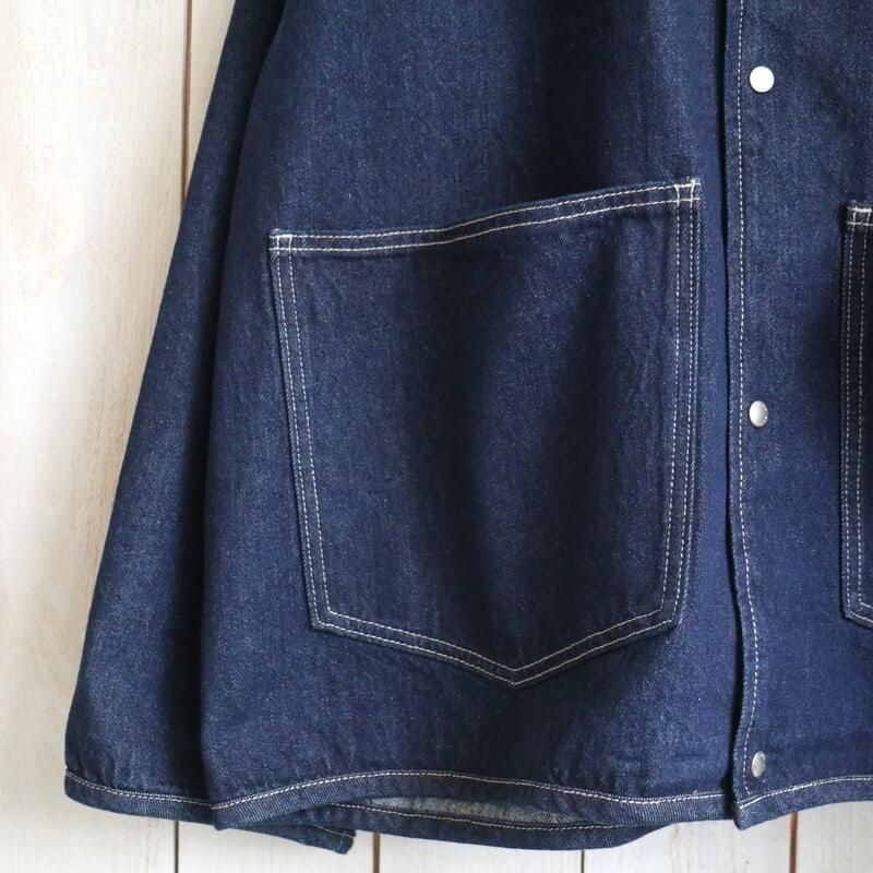 インディゴブルーのボディに白ステッチ、フロントの大きめのパッチポケットがポイント。