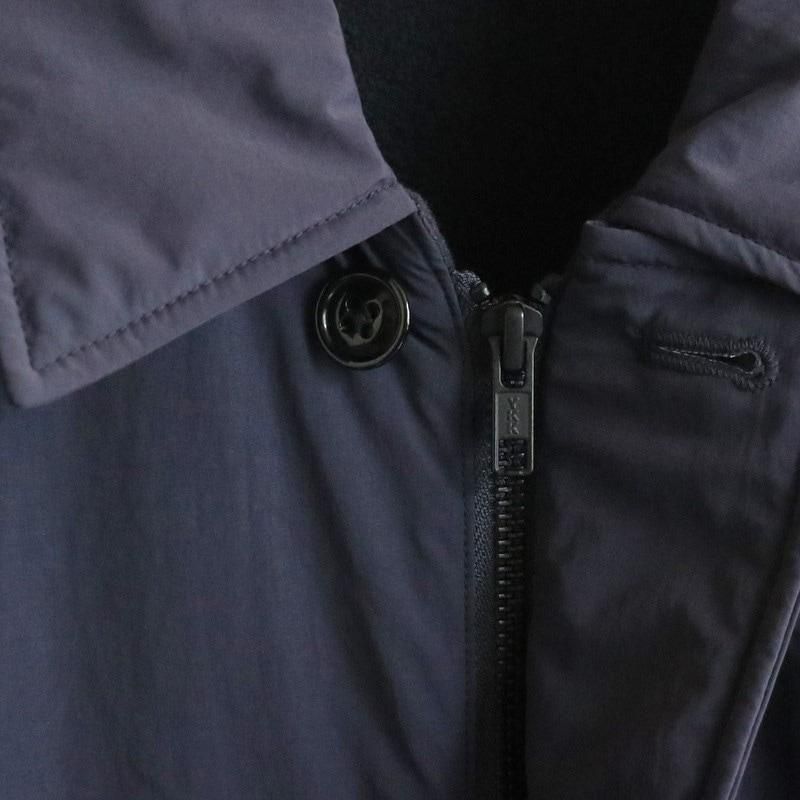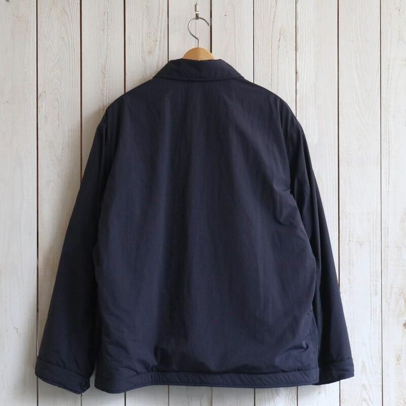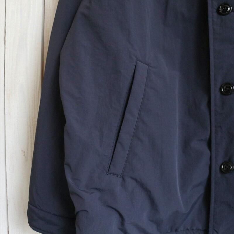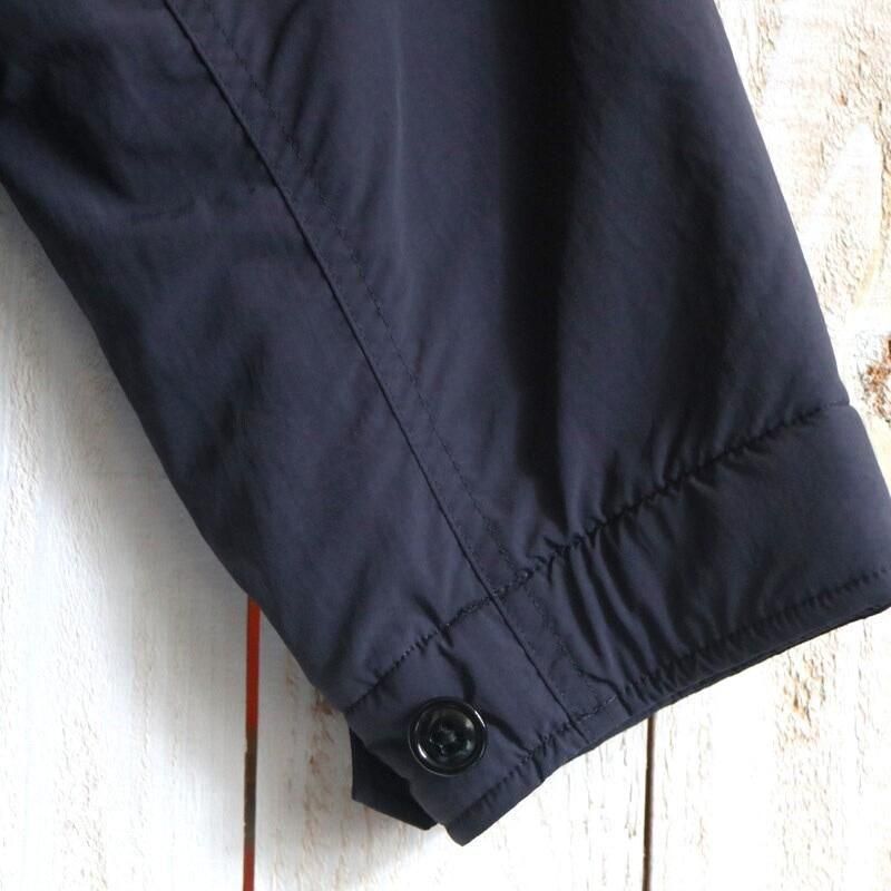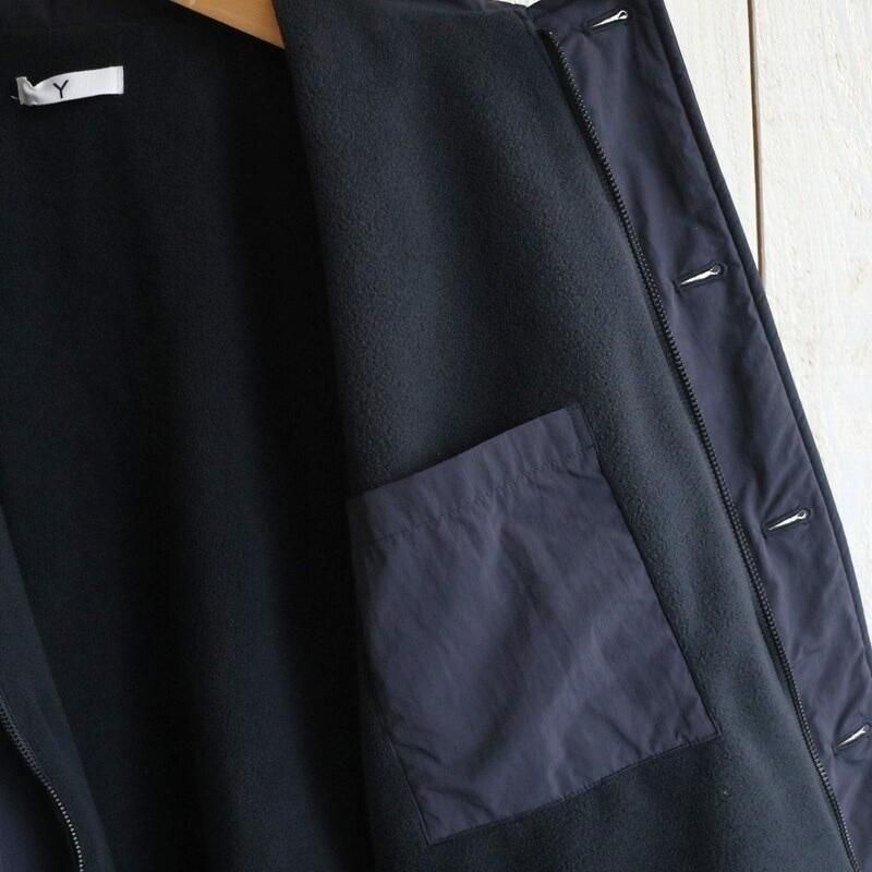 US・NAVYのサブマリンジャケットをベースとした「Y」のアウター。リサイクルナイロン糸の力で生地を高密度でコンパクトにする超収縮糸を使用しており、この加工技術でしなやかさとハリ・コシ感を表現しています。表面は防風・撥水の高機能素材で、裏地にはリサイクルフリースを用いて保温性をもたせています。