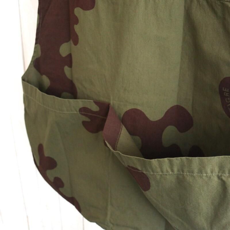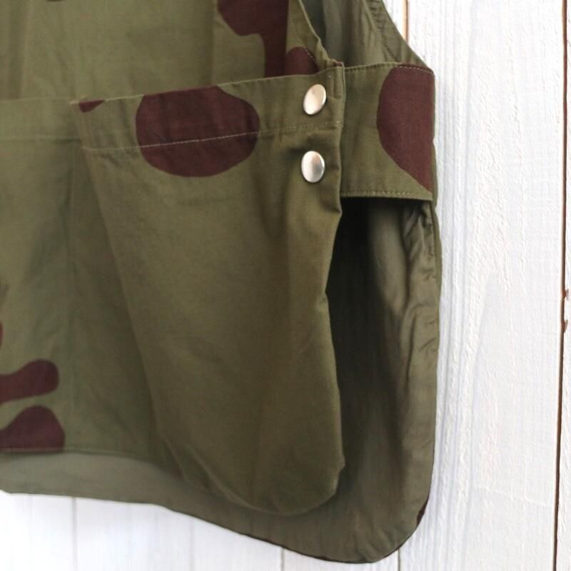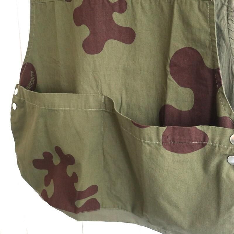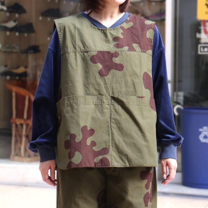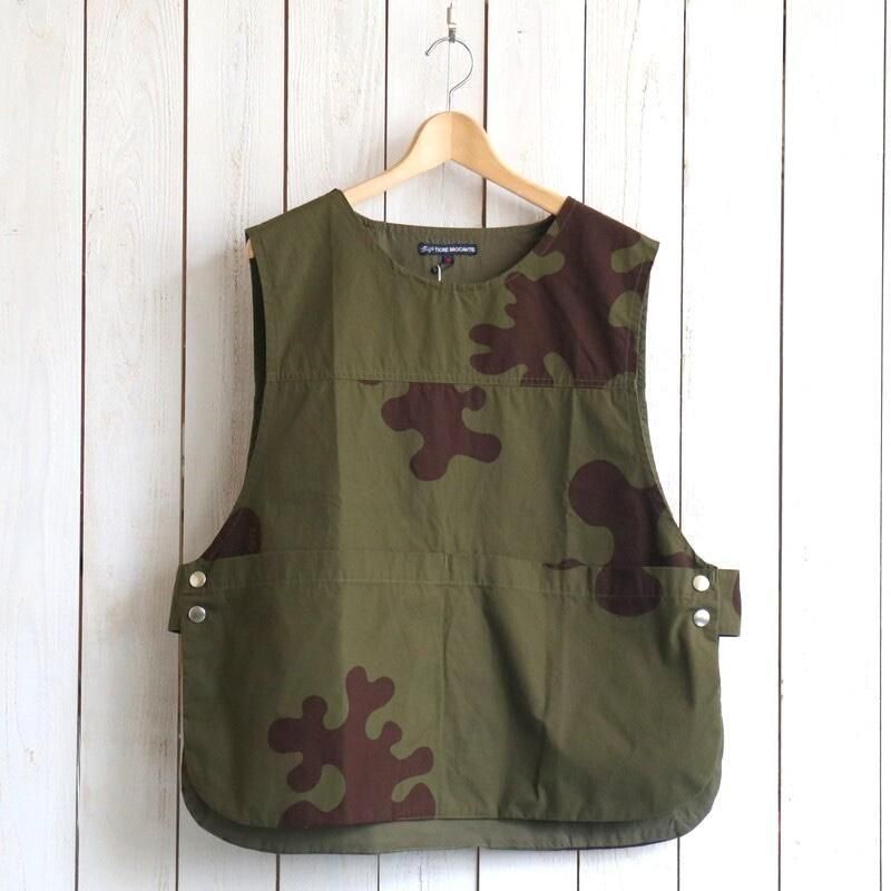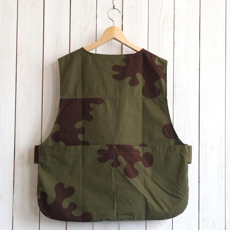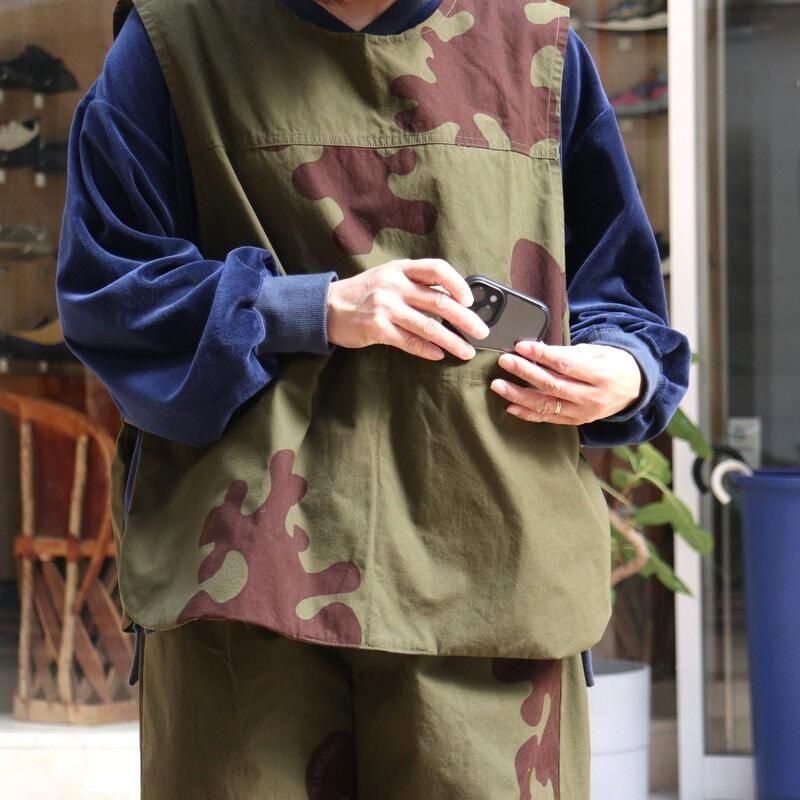 30〜40年代のヨーロッパの軍モノに見られた“アメーバカモ”をベースに、ティグルブロカンテが再解釈したオリジナルカモパターン“TBアメーバカモ”を落とし込んだハンティングビブベスト。大きくうねるようなカモ柄の中にブランドロゴをさりげなく配置し、ミリタリーのルーツと遊び心を両立させているのが魅力の一枚。