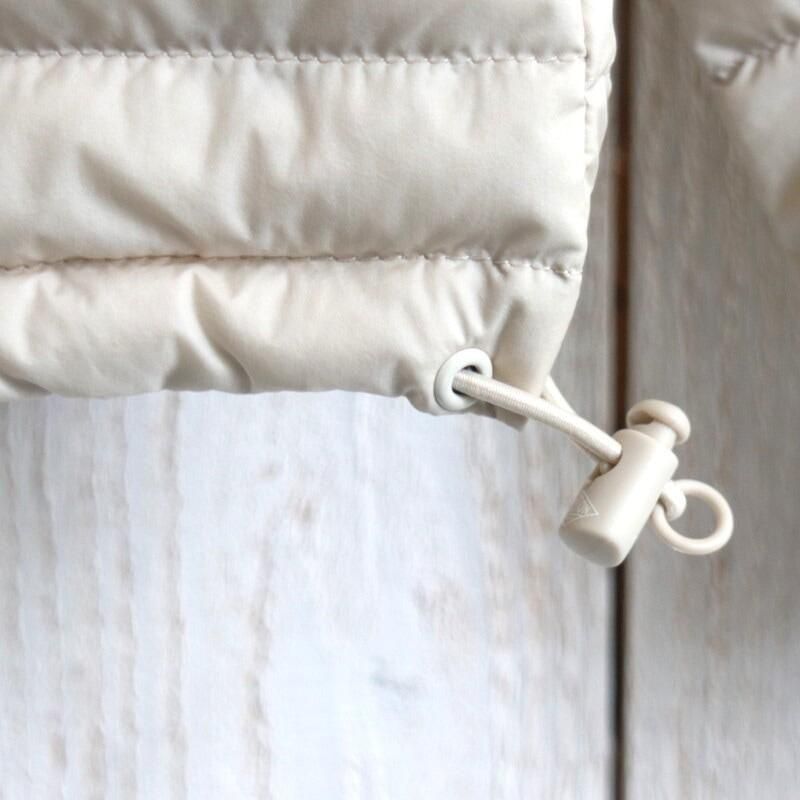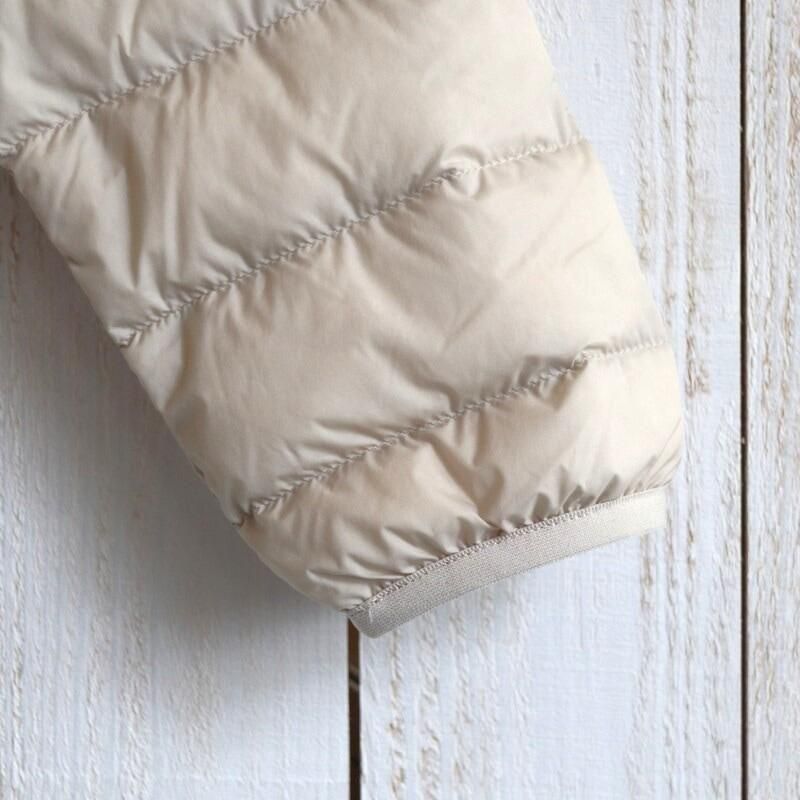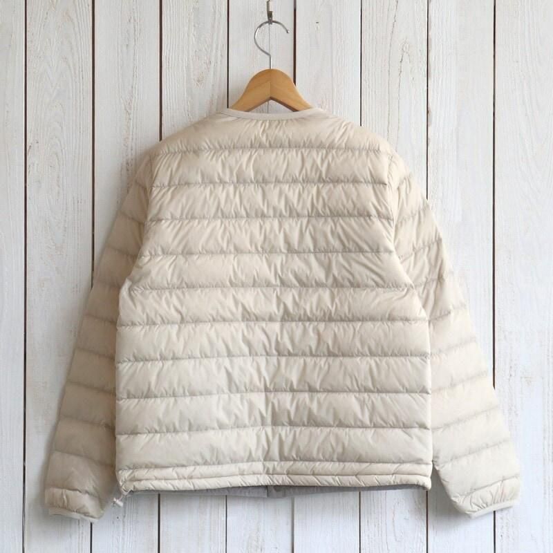マットな表面感のナイロンタフタを使用したインナーダウンジャケット。 適度なフィット感のあるレギュラーフィットのシルエット。 裾のドローコードを絞ることで、シルエットのアレンジや寒気の進入を防ぐことのできる仕様。 中綿にはダウンとフェザーを使用し、ボリューム感を抑えたスマートなフォルムながら保温性を確保。 アウターと合わせればインナーダウンとしても活躍し、秋から春までの長いシーズンに対応します。 マフラー、タートルネックを合わせやすいノーカラーデザイン。 持ち運びに便利な本体と同色のスタッフサック付き。 カーディガン感覚で羽織れるライトアウターとして、また冷え込むシーンのインナーとして、多様なシーンで活躍する一着。