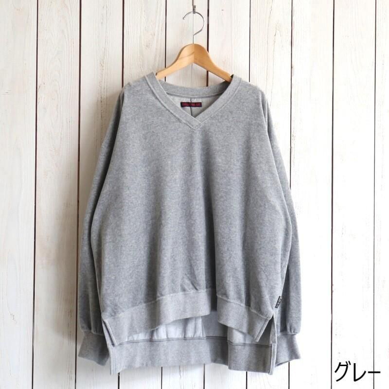 自然な光沢が上品な雰囲気を醸し出しカジュアルからきれいめまで様々な着こなしを楽しめる、上品な光沢を放つ大人のためのベロアVネックトップスです。