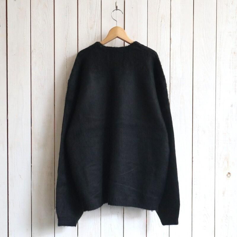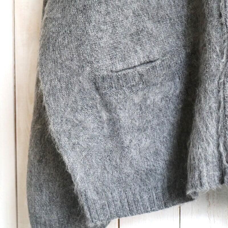 1960〜70年代にリリースされていたカーディガンをベースに、モヘア調のアクリル糸で古着のような質感を再現。シャギー加工によって表面の毛足を立たせ、ヴィンテージ特有の柔らかく奥行きのある風合いを見事に表現しています。アクリル素材ゆえの軽さと、チクチク感のない快適な肌触りも嬉しいポイント。さらに家庭での洗濯が可能という扱いやすさも兼ね備えています。