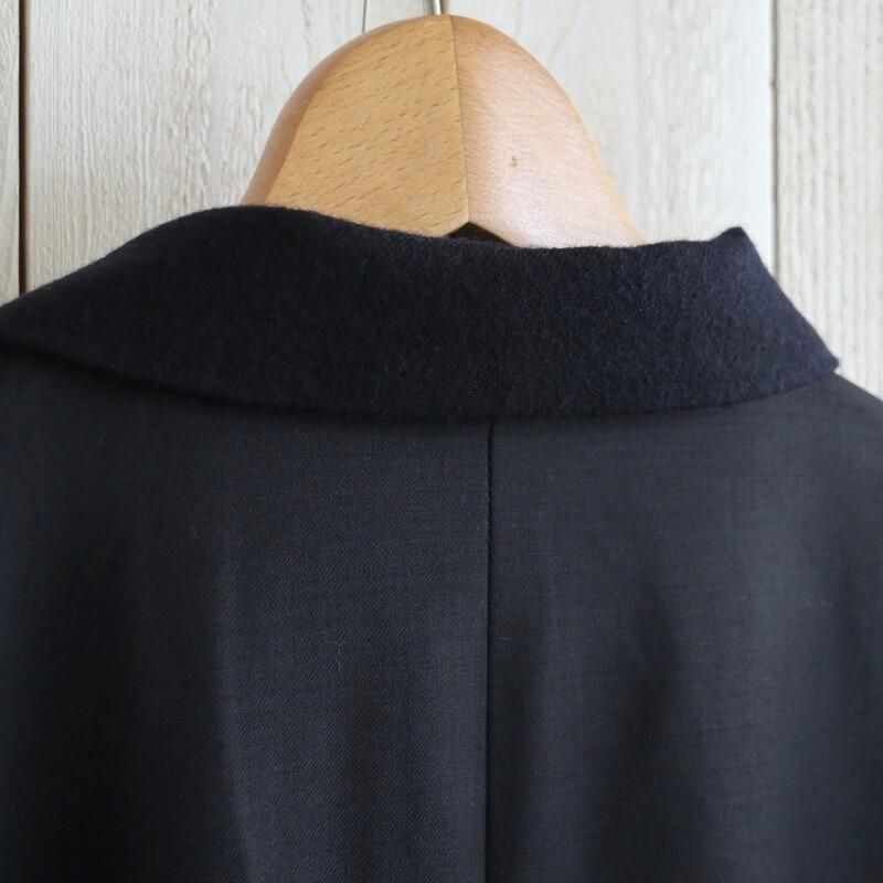 前身頃はマイルドな縮絨を掛けたウール素材、袖部分と背面はシルクをMIXした光沢感のある軽やかなウールスムース素材を使用。