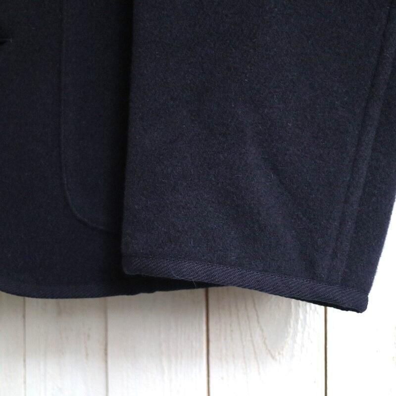 袖裏にはポリエステル素材の裏地が付き、袖通りもスムーズ。前立てから裾にかけて施した杉綾テープのパイピングがアクセント。フェルトのような柔らかい表面感のある生地は、着用感も見た目にも温かく、冬のマストアイテムになりそうです。