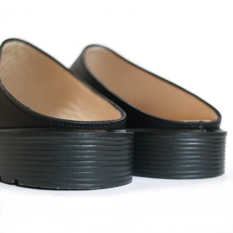 アッパーには足馴染みの良いレザーを使用し、カジュアルからきれいめまで幅広く対応するミニマルなミュール(スリッパタイプ)デザインです。着脱のしやすさと、洗練されたシルエットを両立しています。