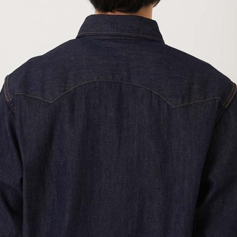 その無骨さと実用性はそのままに、現代のスタイルに合うよう再構築したのが、BLUE BLUEのライトデニム ウエスタンシャツです。