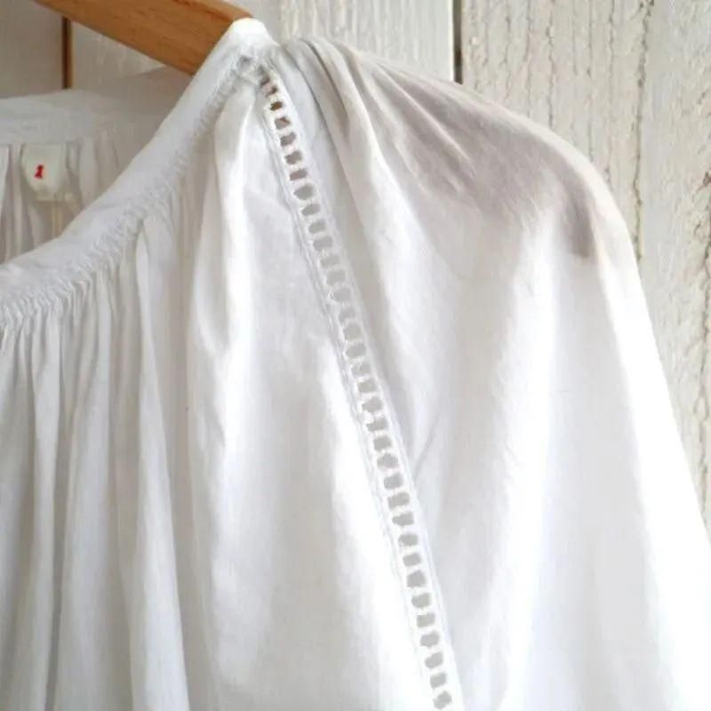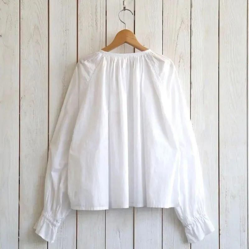 各パーツをハシゴレースで接いだ繊細なルックスのギャザーシャツ。ハイカウントの強撚糸を使用したコットンローン素材は、ほどよい透け感を持ち微光沢感とさらりとした肌触りが特徴。バランス良く着用しやすいショート丈の着丈。袖はあえて長めに設定されており、袖口のレイヤードスタイルもお楽しみいただけます。