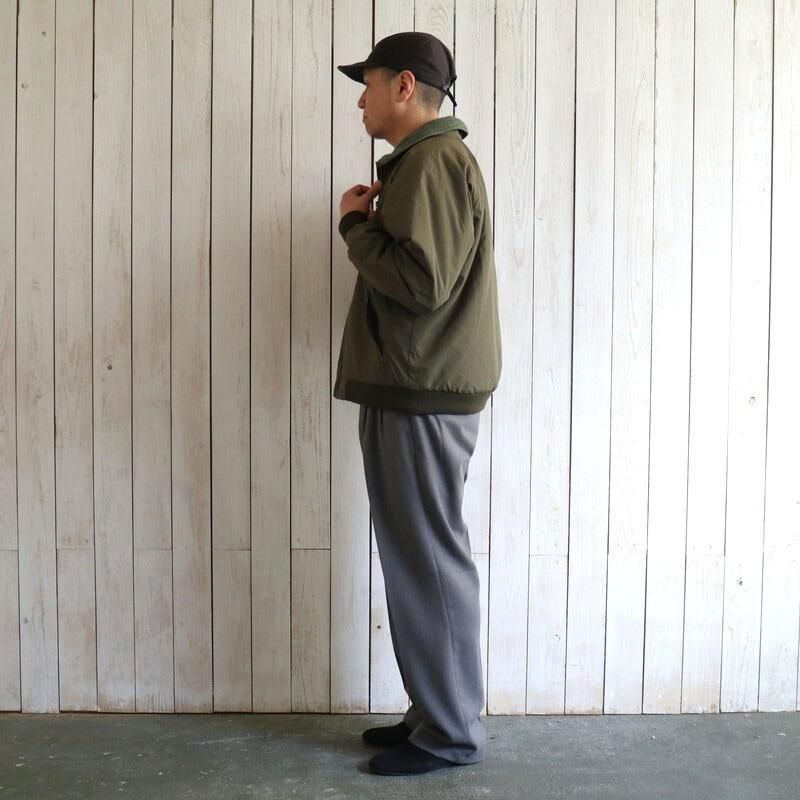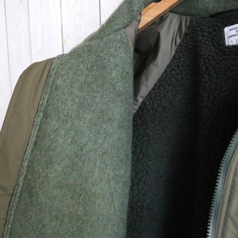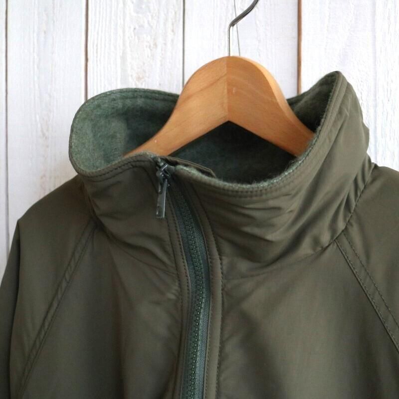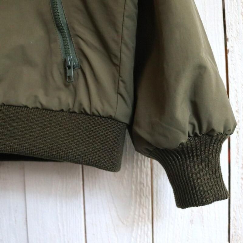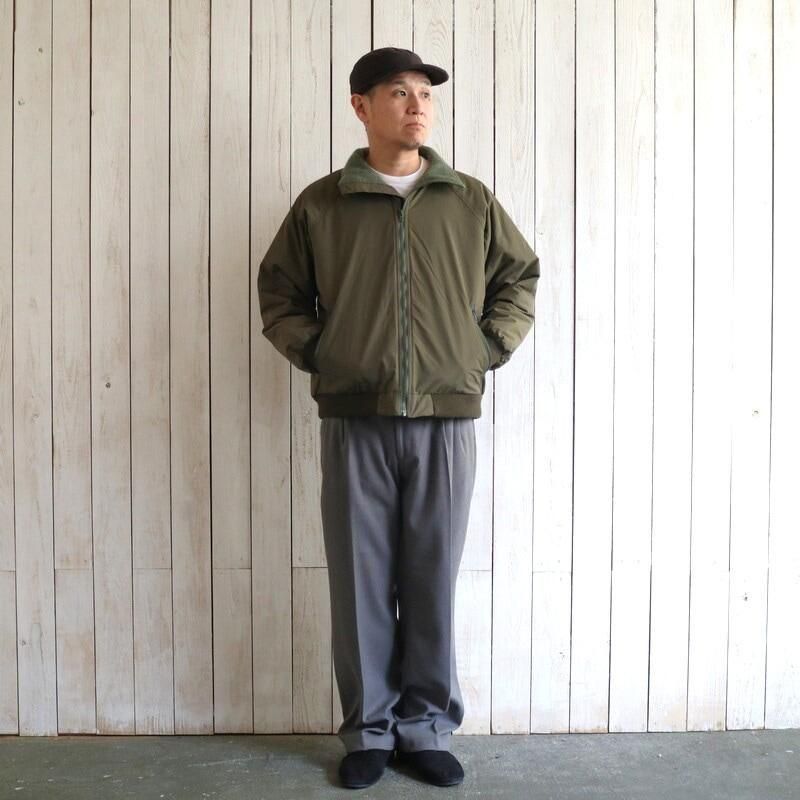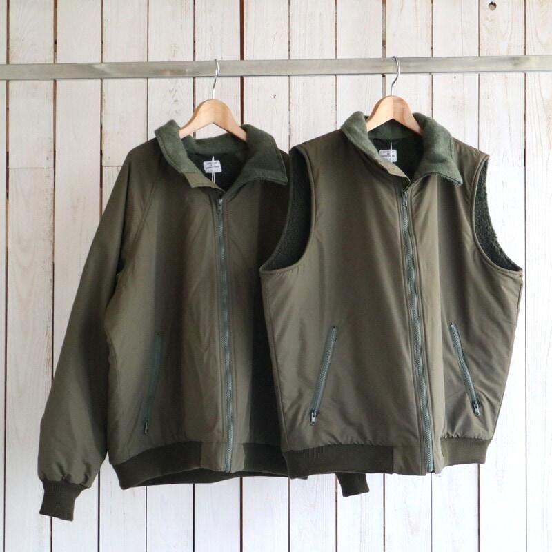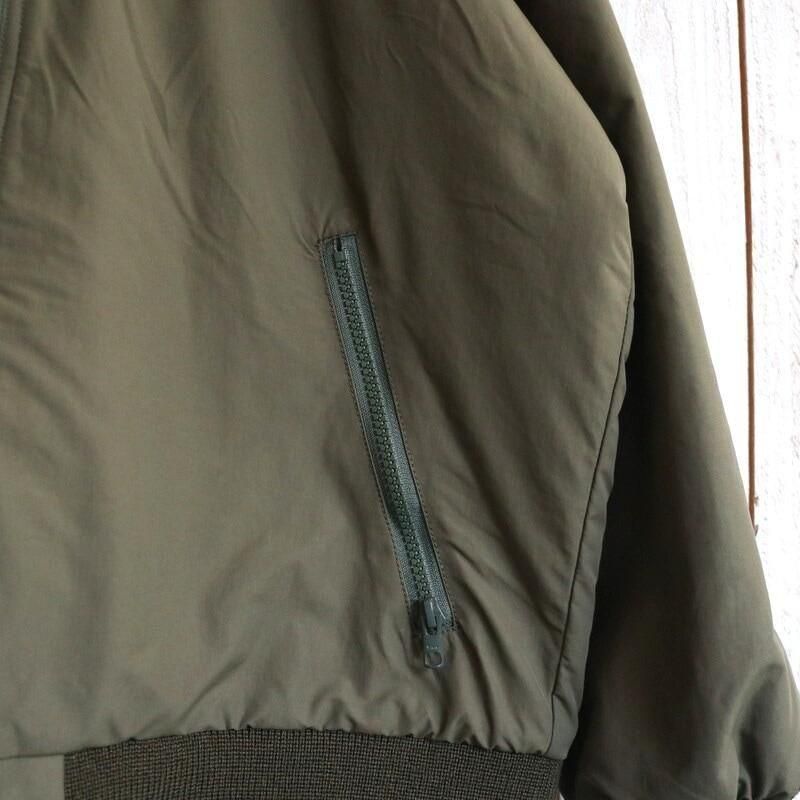 表地はナイロン。 同色のジッパーやテープ、リブ使いが程よくミリタリーな印象を引き立てています。 ライナーにはデッドストックのウールパイルを採用。 滑りがよく、保温性も抜群。着た瞬間に"あ、これは暖かい"と感じる一枚です。